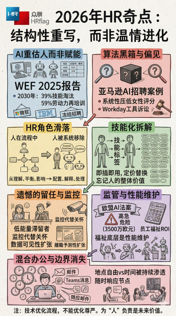 是以,别再轻浅飘地把2026年叫作HR的“奇点”了。这个词太轻了,轻得像一场行业自嗨。对实在身处组织中的东说念主来说,2026年更像一个分水岭:一边是越来越机灵的系统、越来越密的标签、越来越强的酌量技艺、越来越低成本的自动化;另一边,则是越来越稀缺的判断、越来越奋斗的信任、越来越容易被压缩的东说念主性空间。