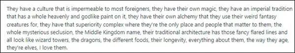 没猜想好意思国东说念主竟然崇敬分析了起来:和据说里的精灵族雷同,中国有特有的文化,悠久的传统(中国历史),可爱龙和精巧的动物(熊猫),吃健康的食品(中餐)。