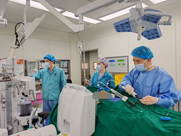 伍瓒副主任医师(右)正在给病东谈主作念微创手术,麻醉师(左)密切监测麻醉,照应(中)严格截止补液。代雯雯 照相