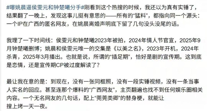 这些匿名爆料,说得那叫一个无庸置疑,仿佛他们等于姚晨的“贴身助理”,知谈总共内幕。