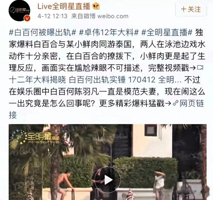狗仔卓伟团队放出视频,说白百何婚内出轨,和小鲜肉在泳池里“亲密互动”,还出现了所谓的“一指禅”。