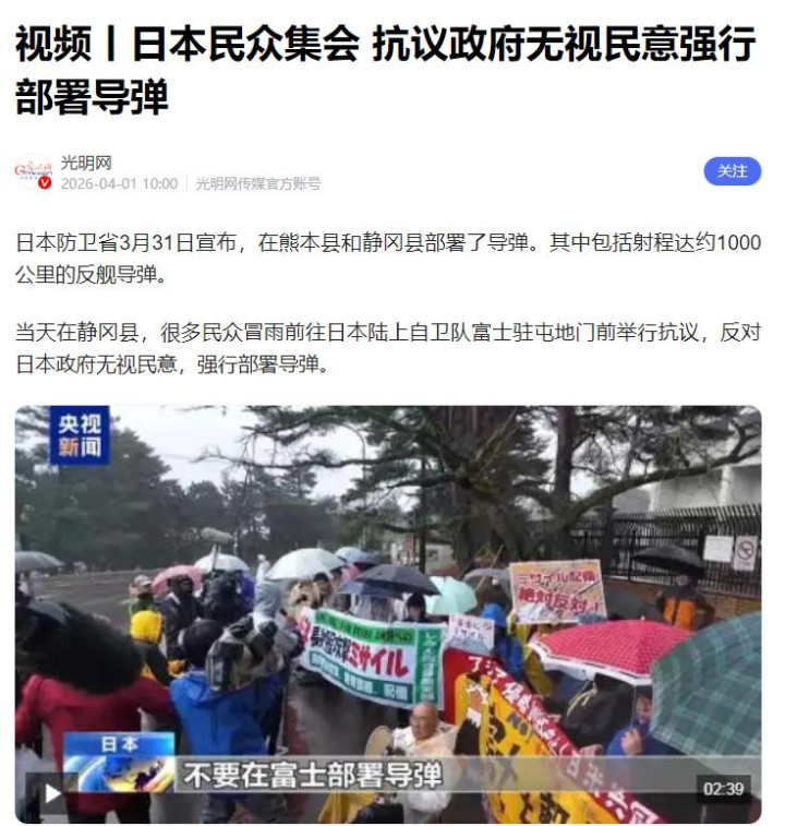 3月31日,熊本县老庶民自觉聚在健军驻屯地旁,举着“不想要导弹”“反对部署”的牌子抗议,他们怕导弹放家门口,一朝发生冲突,我方家第一个遇袭,可驻防省连个确认皆莫得。