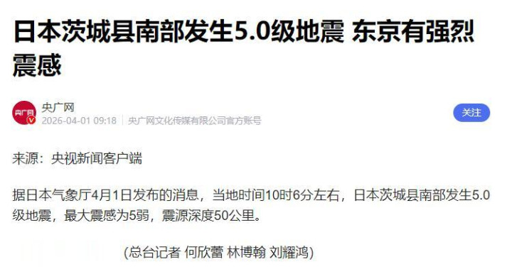 高市这边刚为部署导弹自我赏玩,不到24小时,也等于4月1日上昼,茨城县南部就发生了5.0级地震,震源50公里深,东京皆有强横震感。