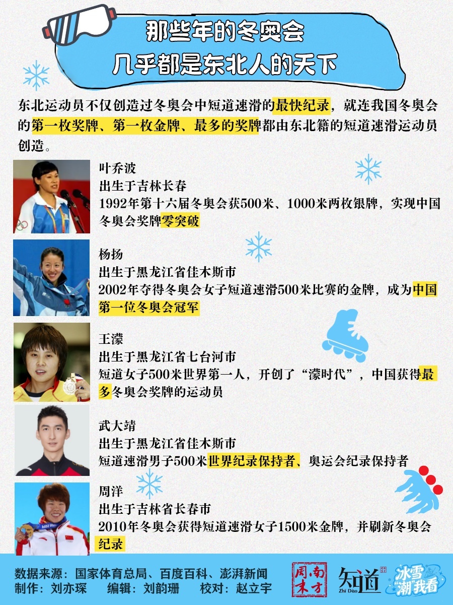 出身于吉林长春的叶乔波,在1992年的冬奥会中获取了500米、1000米两枚银牌,齐备了中国冬奥会奖牌零的突破;出身于黑龙江省佳木斯市的杨扬,在2002年夺得了冬奥会女子短谈速滑500米比赛的金牌,成为了中国第一位冬奥会冠军;出身于黑龙江省七台河市的王濛被称为短谈女子500米世界第一人,是中国获取最多冬奥会奖牌的通顺员,更始创了“濛期间”……